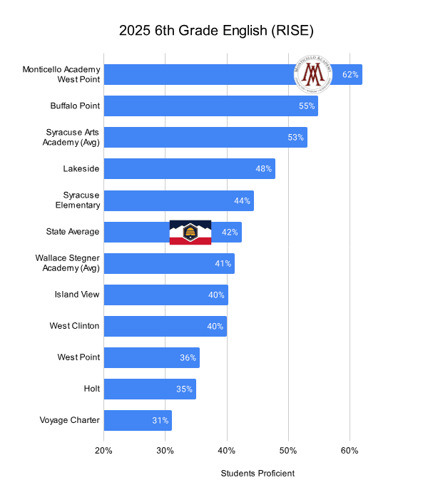 Across all tested subjects—English Language Arts, Math, and Science—Monticello Academy 6th graders lead the peer group and exceed state averages by a significant margin. In 2025: