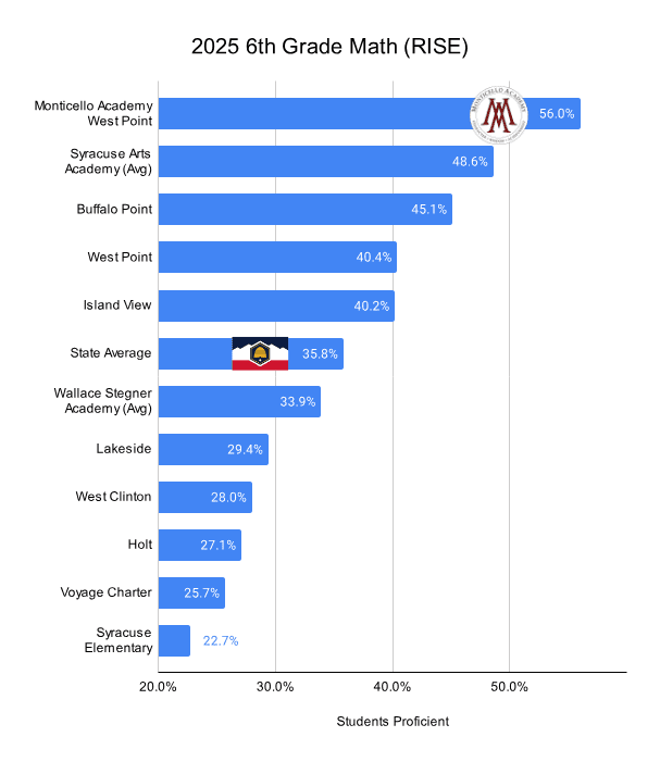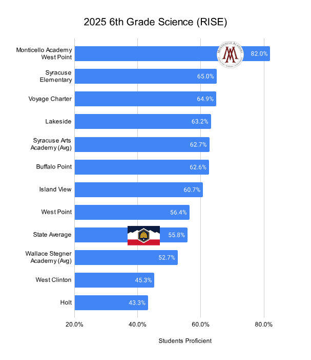 - 82% of Monticello Academy’s 6th grade students demonstrated proficiency in Science, compared to a state average of 55.8%